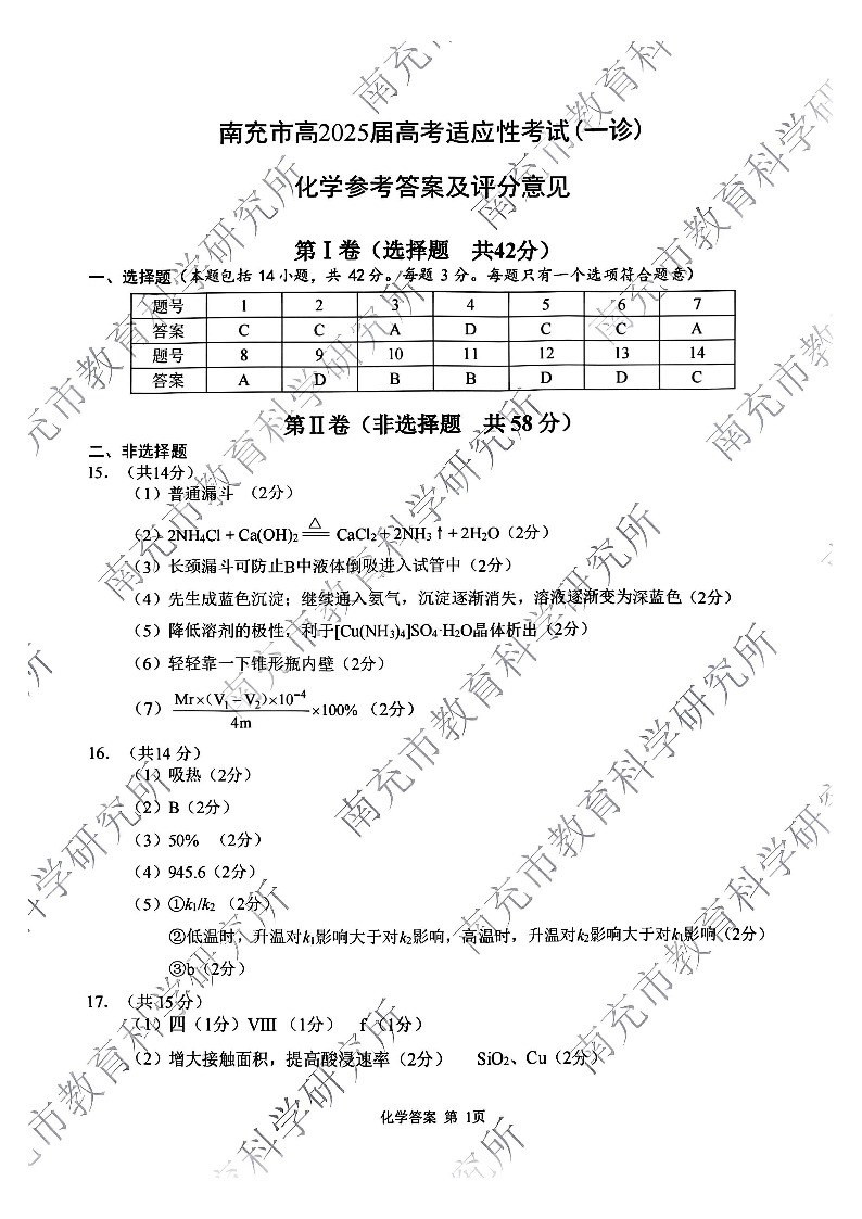 四川省南充市2025届高三高考适应性考试(一诊)化学试题答案