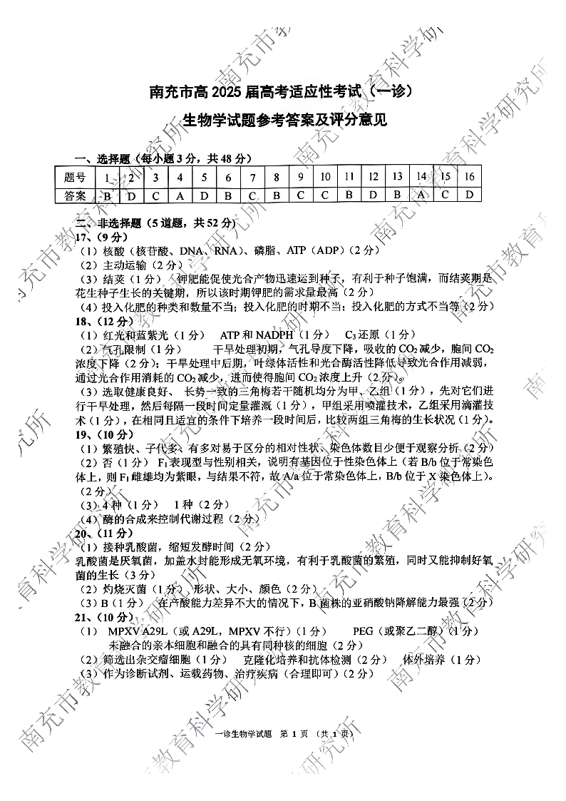 四川省南充市2025届高三高考适应性考试(一诊)生物试题答案