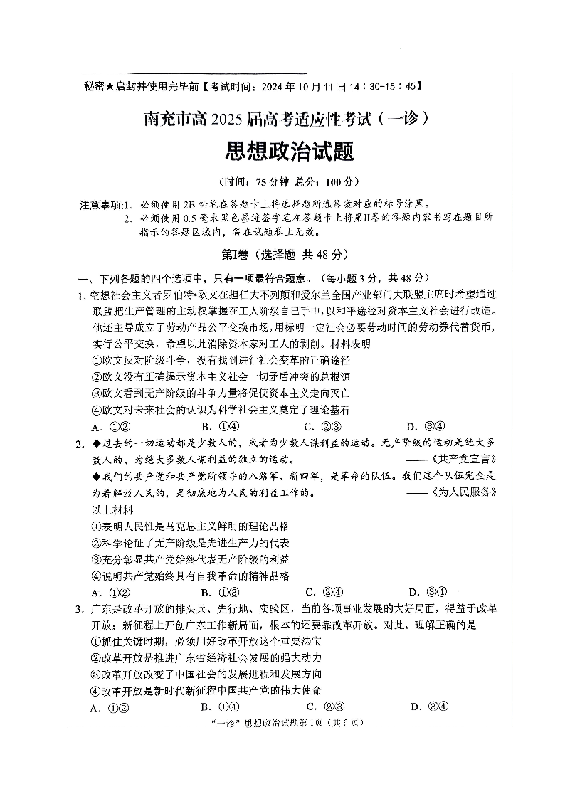 四川省南充市2025届高三高考适应性考试(一诊)政治试题