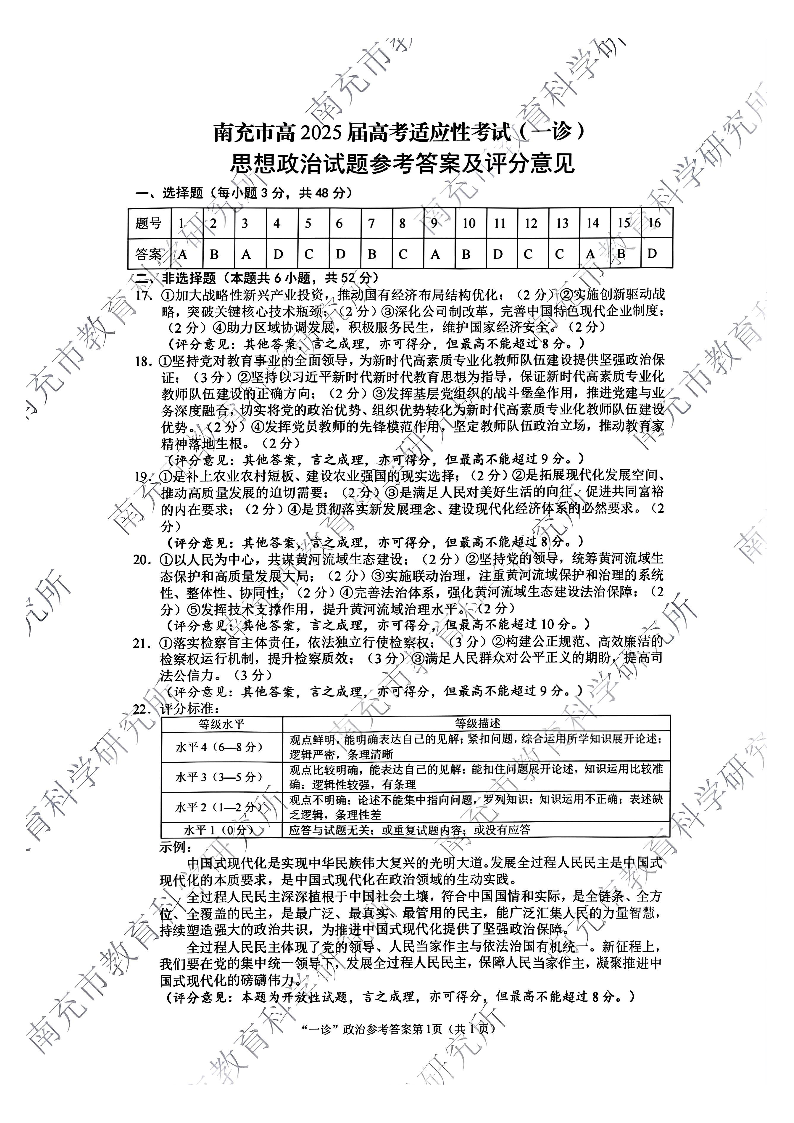 四川省南充市2025届高三高考适应性考试(一诊)政治试题答案