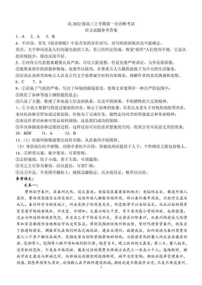 四川省宜宾市叙州区高2022级高三上学期第一次诊断考试语文试题答案