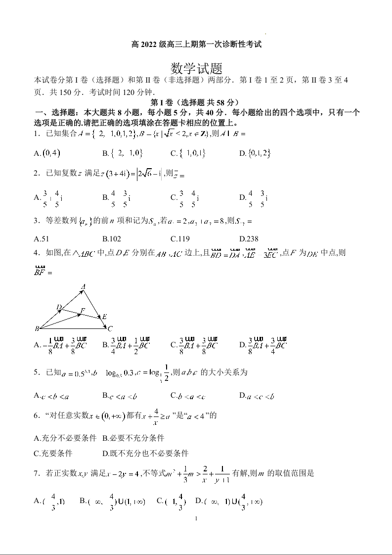 四川省宜宾市叙州区高2022级高三上学期第一次诊断考试数学试题