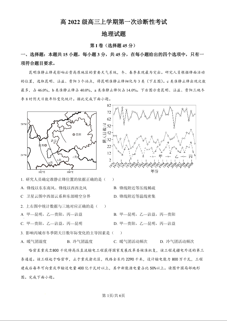 四川省宜宾市叙州区高2022级高三上学期第一次诊断考试地理试题(原卷版)