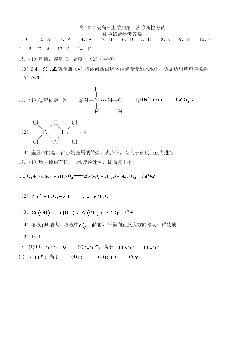 四川省宜宾市叙州区高2022级高三上学期第一次诊断考试化学试题答案