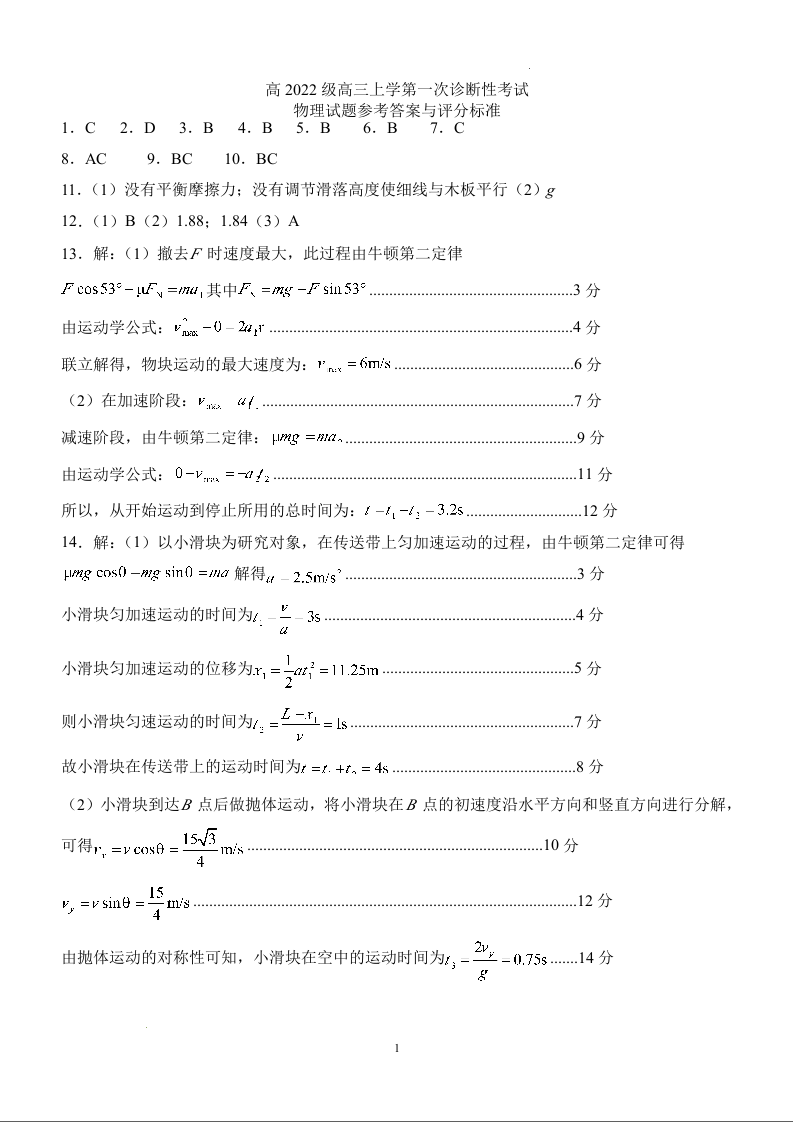 四川省宜宾市叙州区高2022级高三上学期第一次诊断考试物理试题答案