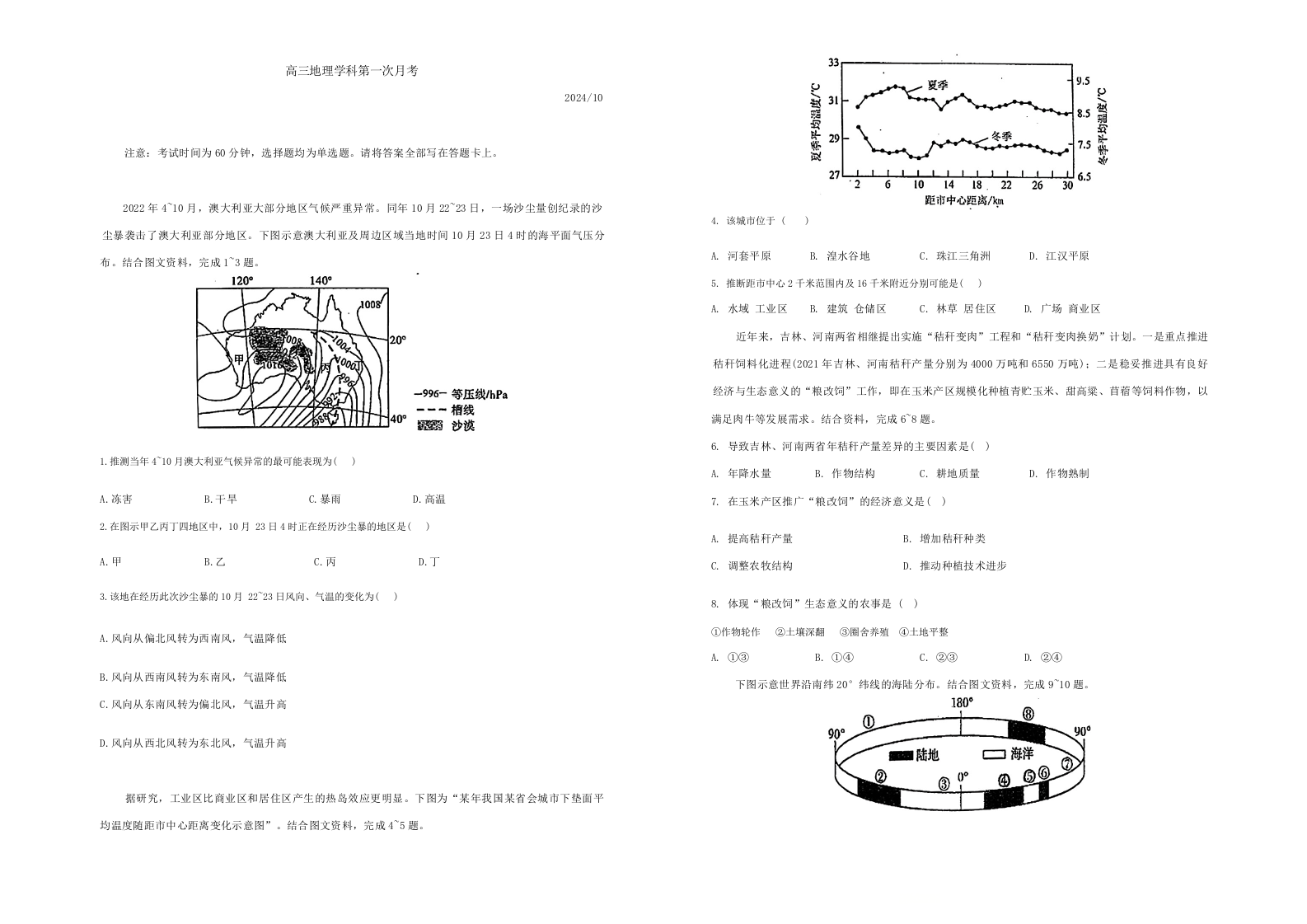 天津市南开中学2024-2025学年高三上学期10月月考地理