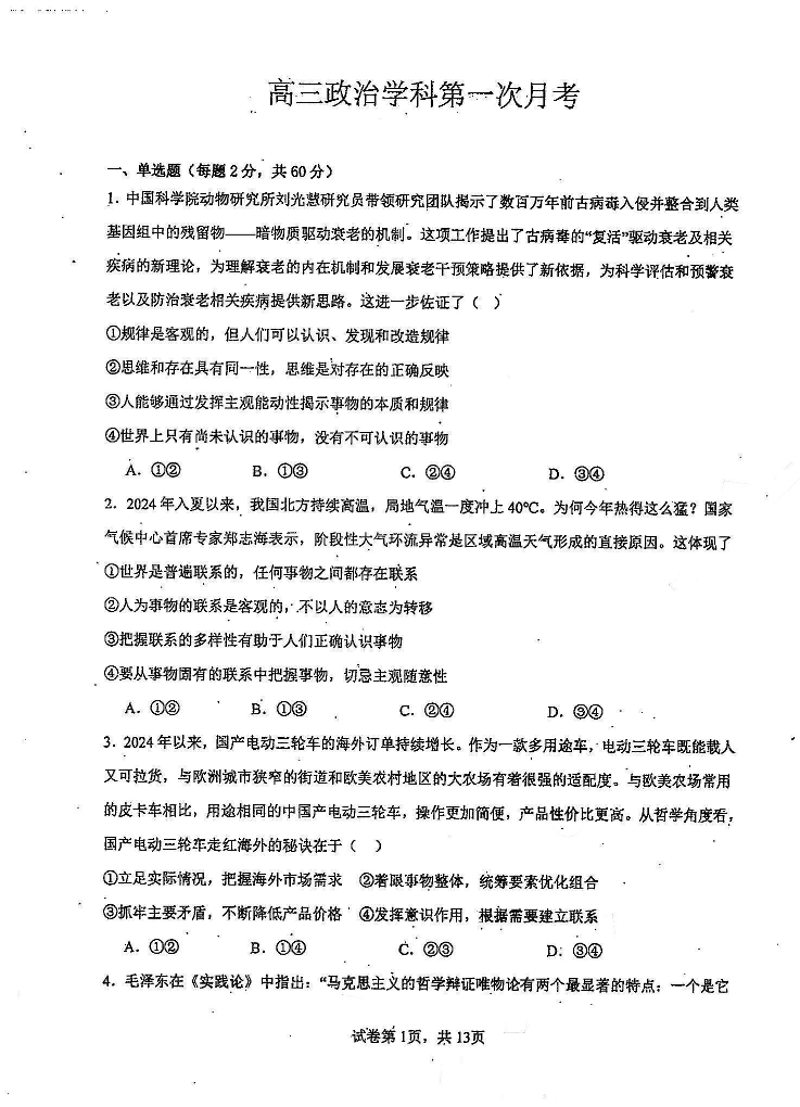 天津市南开中学2024-2025学年高三上学期10月月考政治