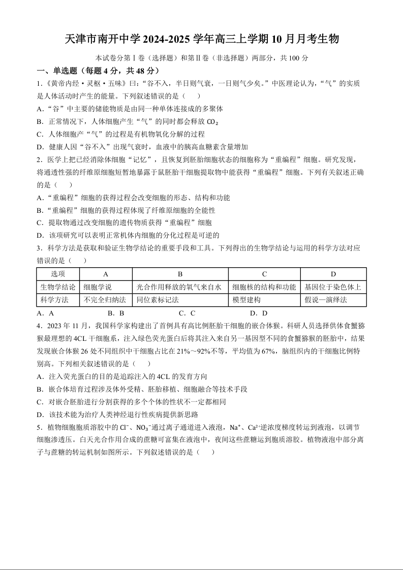 天津市南开中学2025届高三上学期10月月考生物+答案