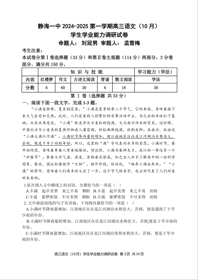天津市静海区第一中学2024-2025第一学期高三学生学业能力调研试卷语文+答案
