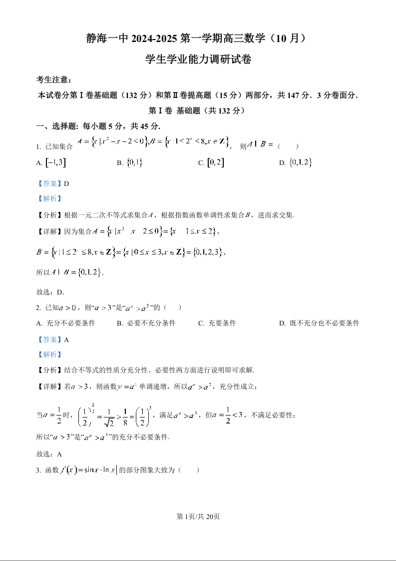天津市静海区第一中学2024-2025第一学期高三学生学业能力调研试卷数学试题(解析版)