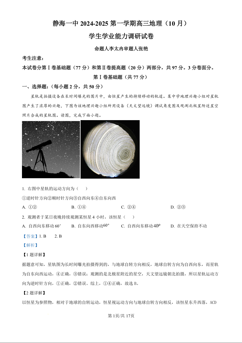 天津市静海区第一中学2024-2025第一学期高三学生学业能力调研试卷地理试题(解析版)