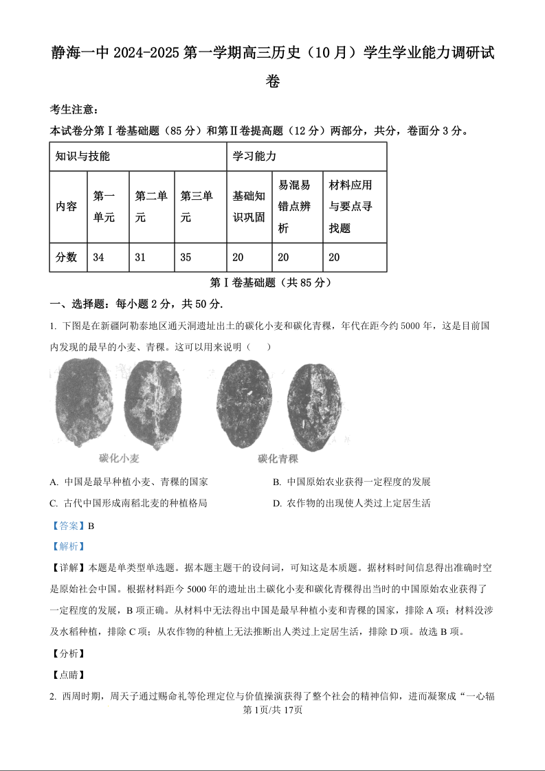 天津市静海区第一中学2024-2025第一学期高三学生学业能力调研试卷历史试题(解析版)