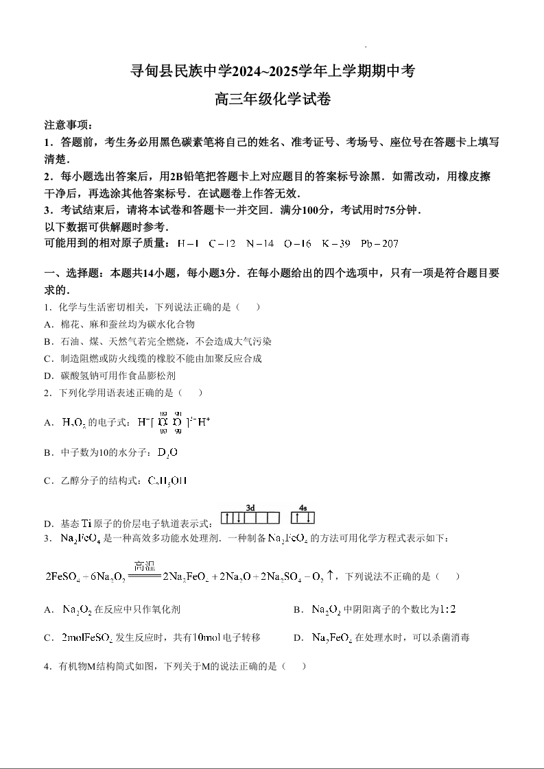 云南省大理白族自治州宾川县高平第一完全中学2025届高三上学期期中考试化学+答案