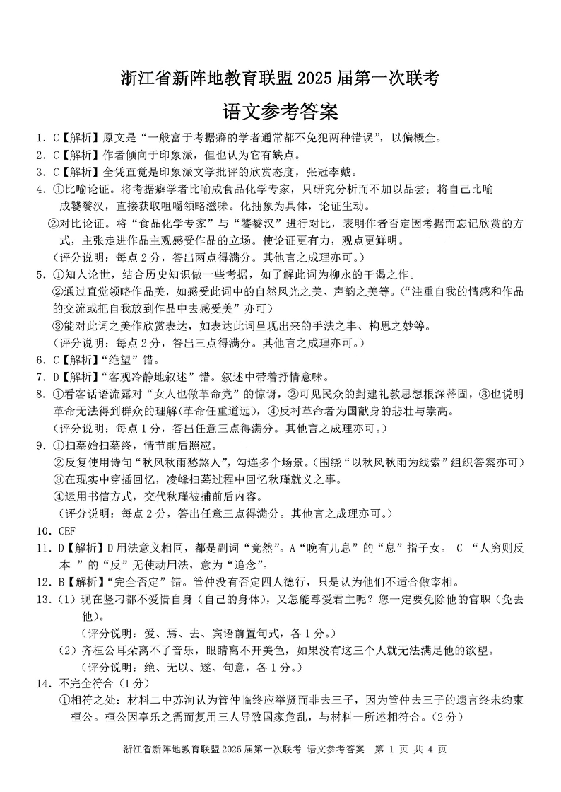 浙江卷浙江省新阵地教育联盟 2025 届第一次联考语文答案
