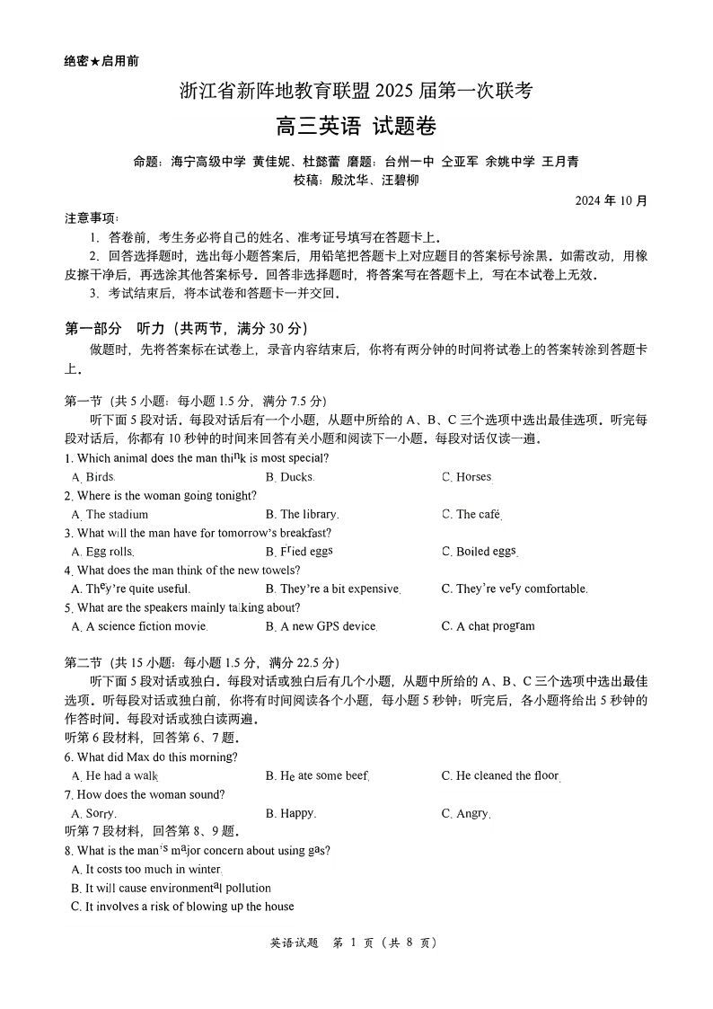 浙江卷浙江省新阵地教育联盟 2025 届第一次联考英语
