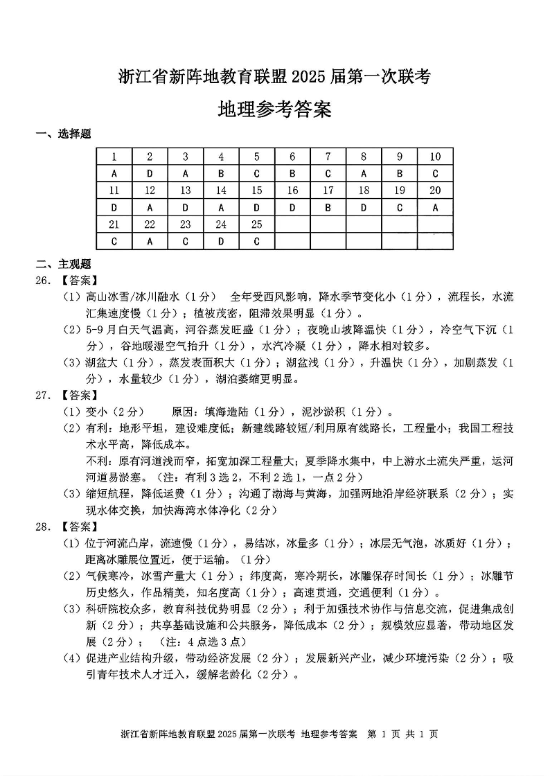 浙江卷浙江省新阵地教育联盟 2025 届第一次联考地理答案