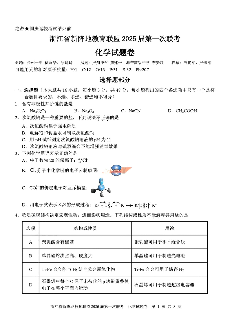 浙江卷浙江省新阵地教育联盟 2025 届第一次联考化学