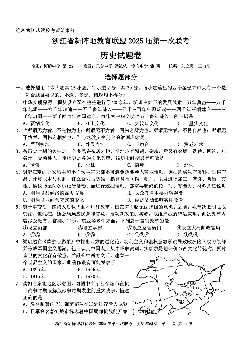 浙江卷浙江省新阵地教育联盟 2025 届第一次联考历史