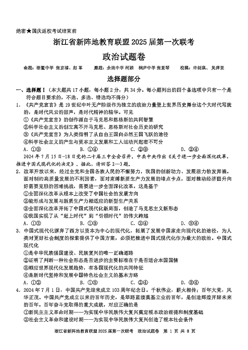 浙江卷浙江省新阵地教育联盟 2025 届第一次联考政治