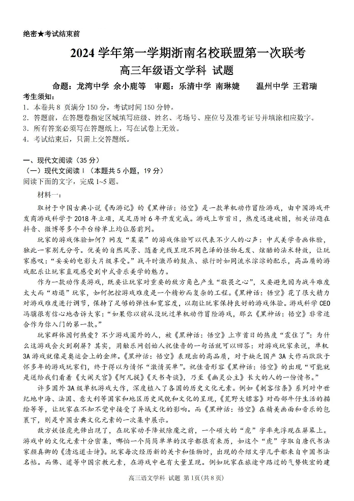 浙江省2024学年第一学期浙南名校联盟第一次联考语文
