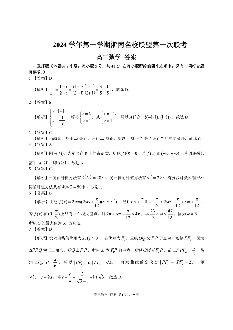 浙江省2024学年第一学期浙南名校联盟第一次联考数学答案
