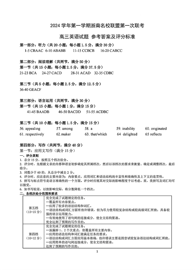 浙江省2024学年第一学期浙南名校联盟第一次联考英语答案