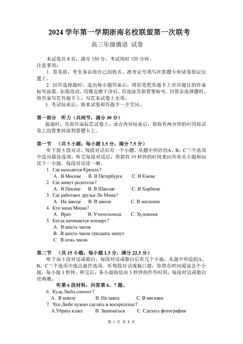 浙江省2024学年第一学期浙南名校联盟第一次联考俄语