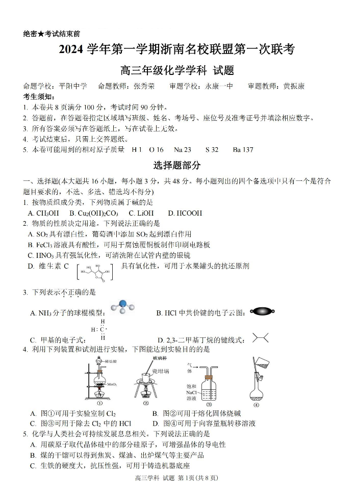 浙江省2024学年第一学期浙南名校联盟第一次联考化学