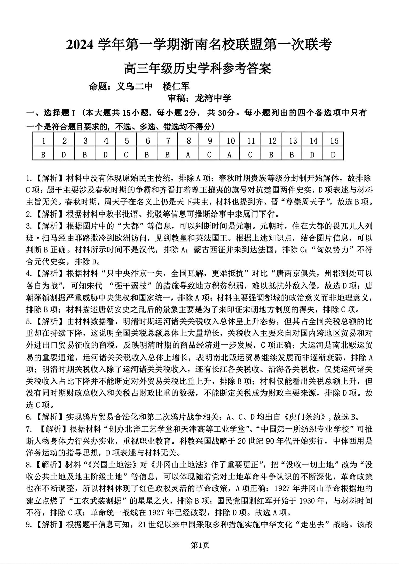 浙江省2024学年第一学期浙南名校联盟第一次联考历史答案
