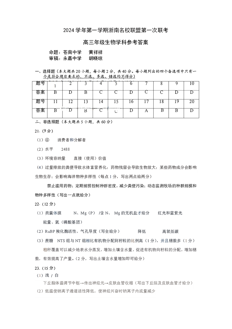 浙江省2024学年第一学期浙南名校联盟第一次联考生物答案