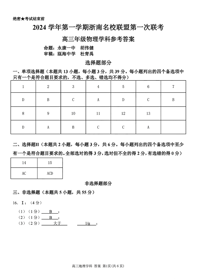 浙江省2024学年第一学期浙南名校联盟第一次联考物理答案