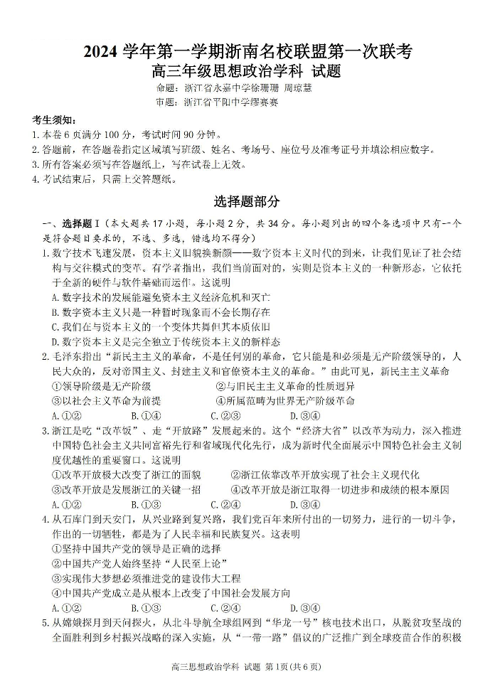 浙江省2024学年第一学期浙南名校联盟第一次联考政治
