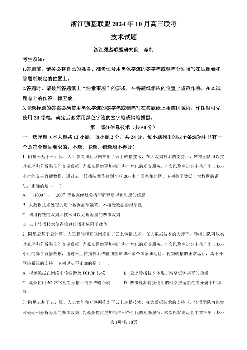 浙江省强基联盟2024年10月高三联考信息技术试题