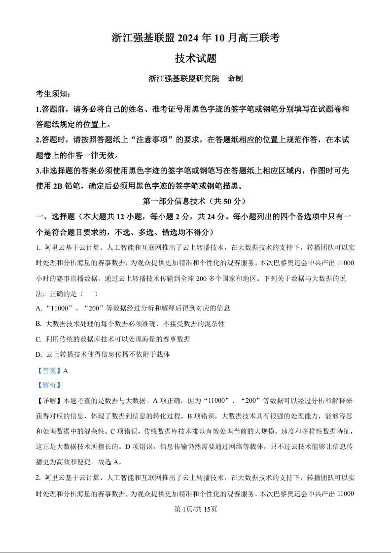 浙江省强基联盟2024年10月高三联考信息技术试题答案