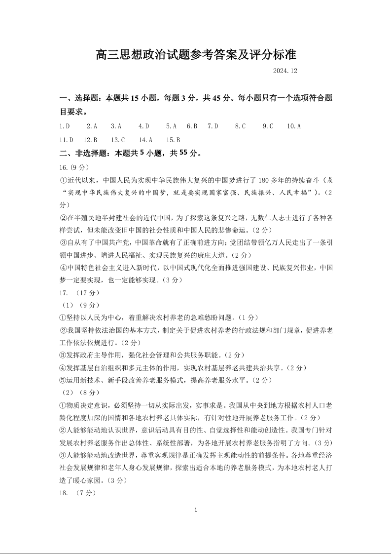 山东省济南市名校考试联盟2024.12高三年级阶段性检测政治答案