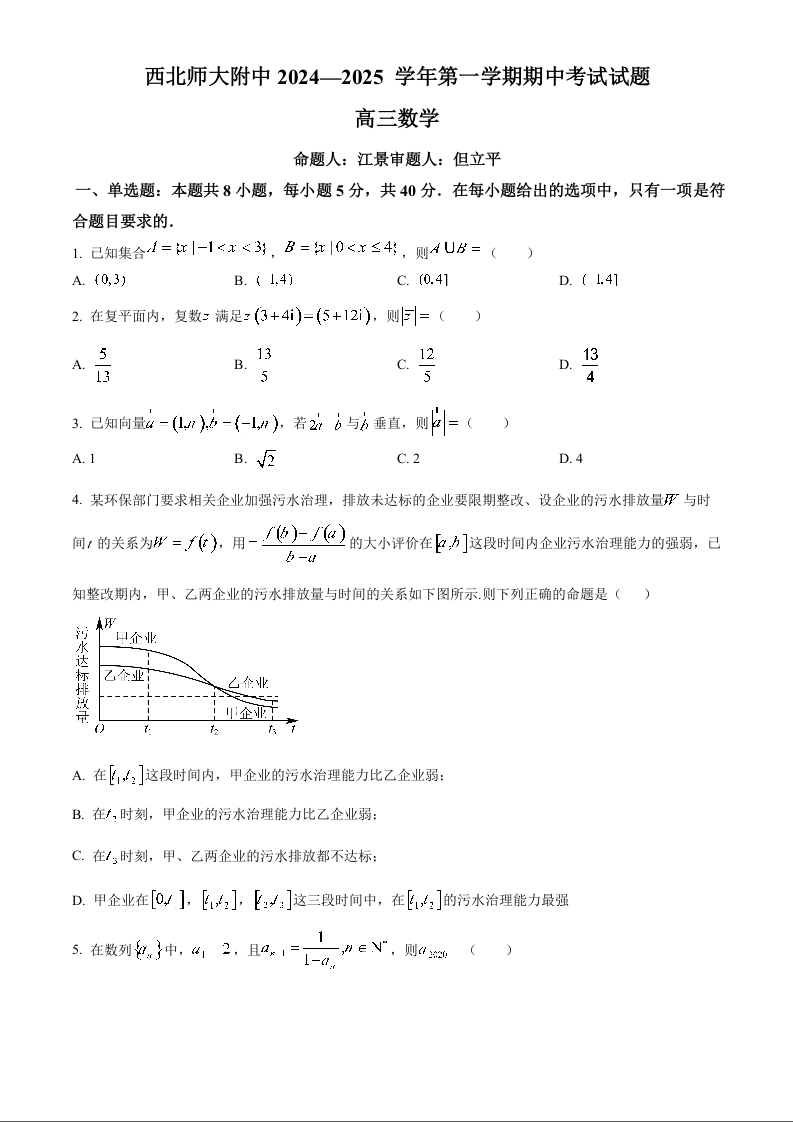 甘肃省西北师范大学附属中学2025届高三上学期期中考试数学含部分答案