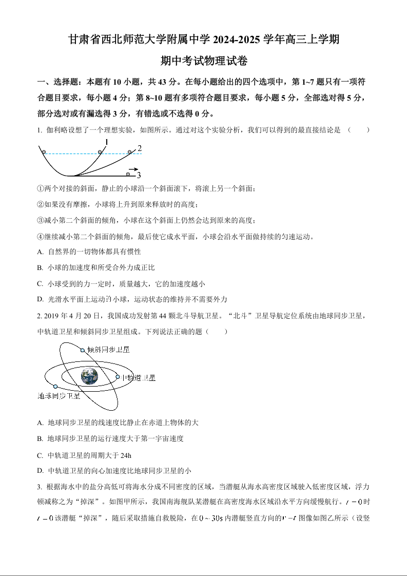 甘肃省西北师范大学附属中学2025届高三上学期期中考试物理含答案