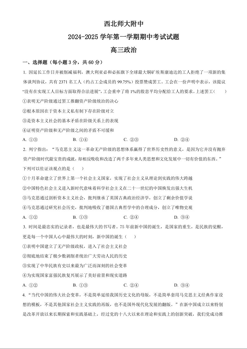 甘肃省西北师范大学附属中学2025届高三上学期期中考试政治含答案