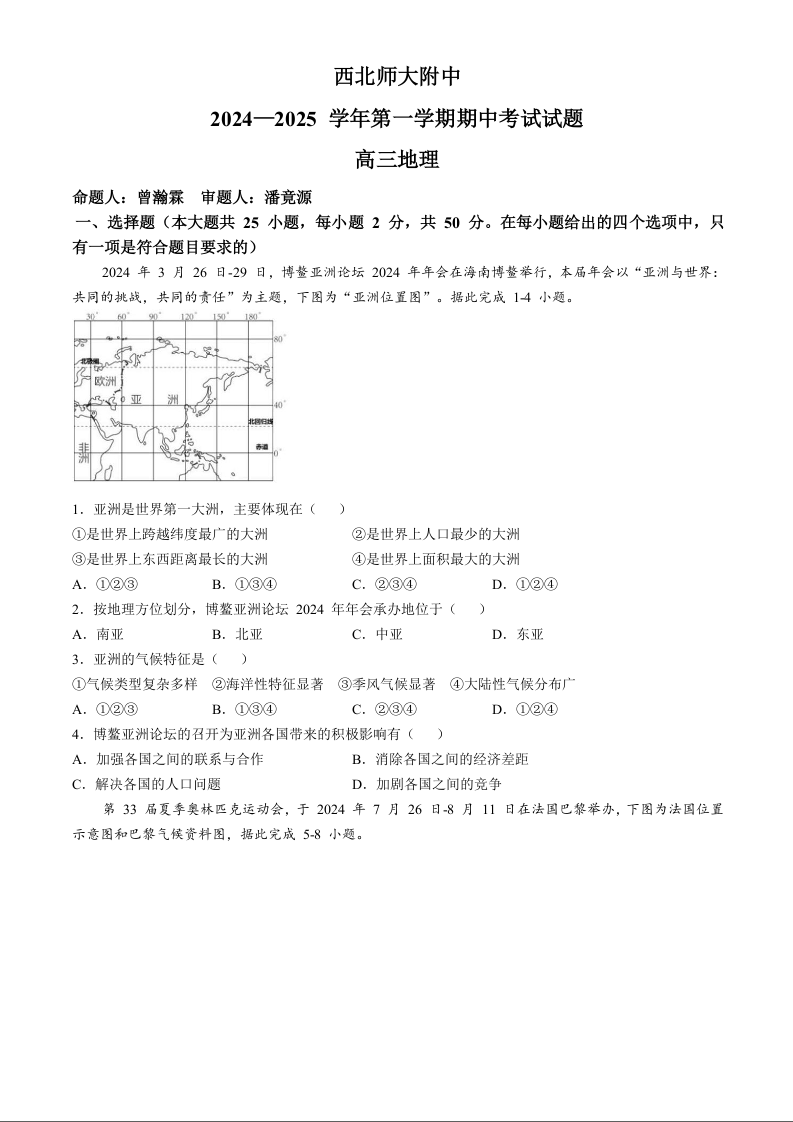 甘肃省西北师范大学附属中学2025届高三上学期期中考试地理含答案