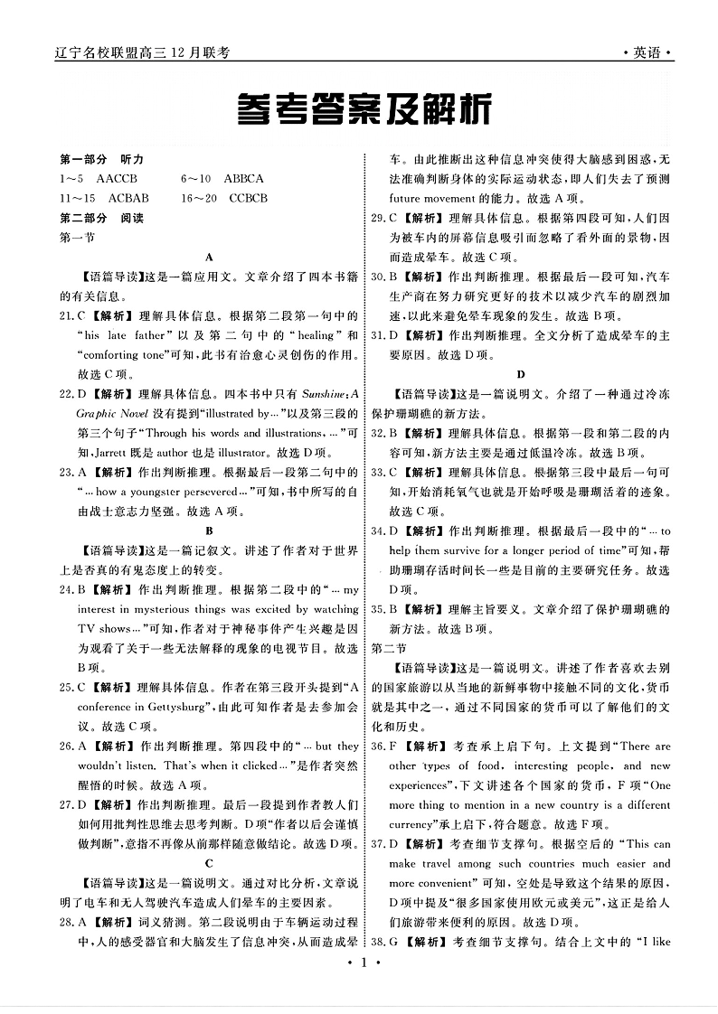 辽宁省名校联盟2024年高三12月份联合考试英语答案
