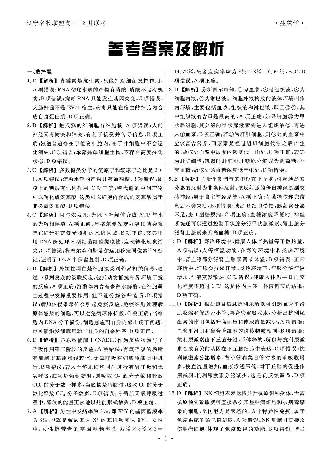 辽宁省名校联盟2024年高三12月份联合考试生物答案