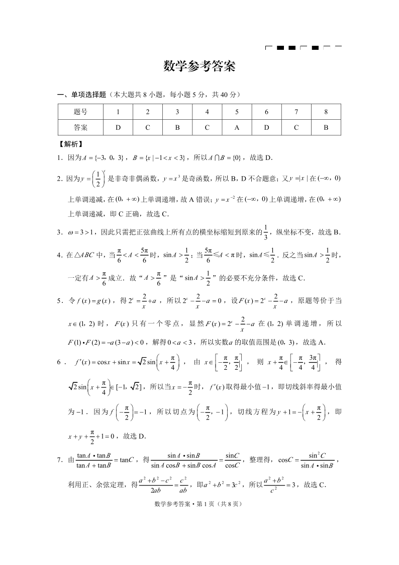 重庆市巴蜀中学2025届高考适应性月考卷(二)数学答案