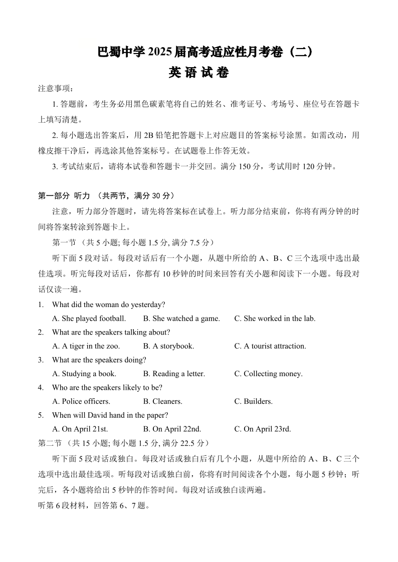 重庆市巴蜀中学2025届高考适应性月考卷(二)英语