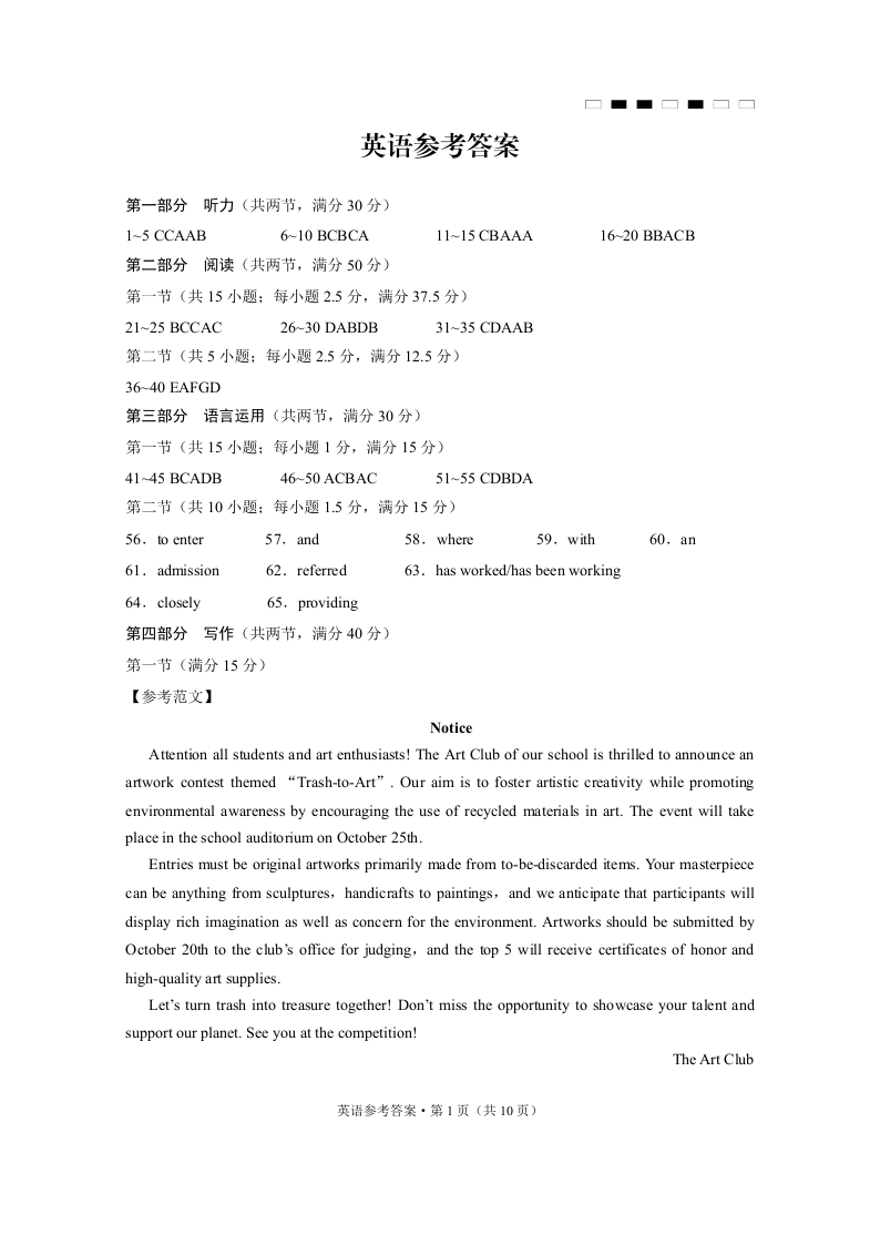 重庆市巴蜀中学2025届高考适应性月考卷(二)英语答案