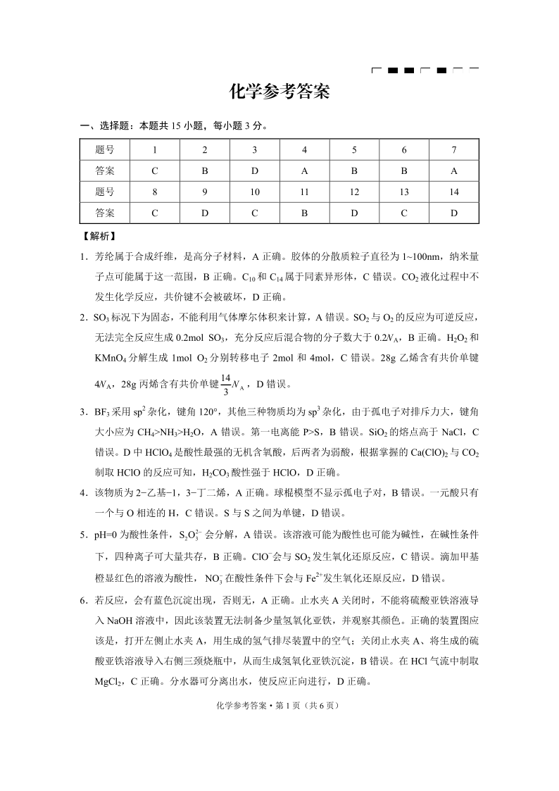 重庆市巴蜀中学2025届高考适应性月考卷(二)化学答案