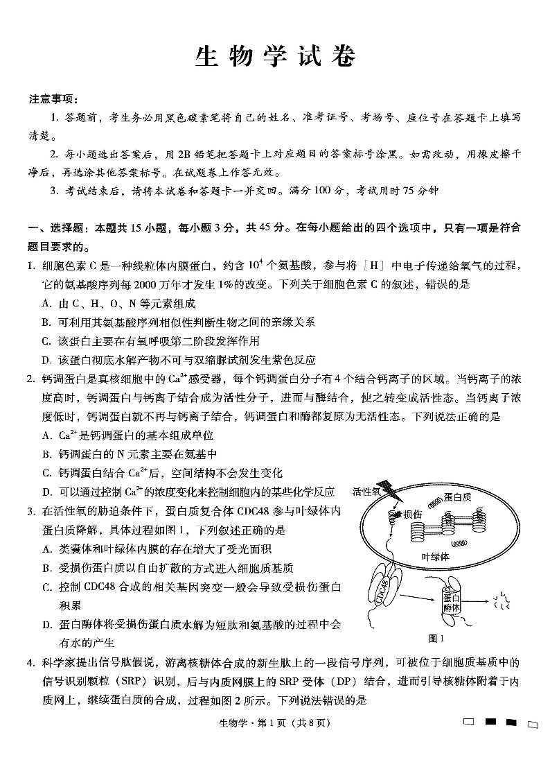 重庆市巴蜀中学2025届高考适应性月考卷(二)生物