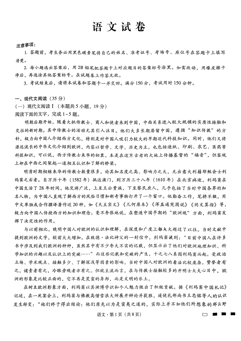 重庆市第八中学2025届高考适应性月考卷(二)语文