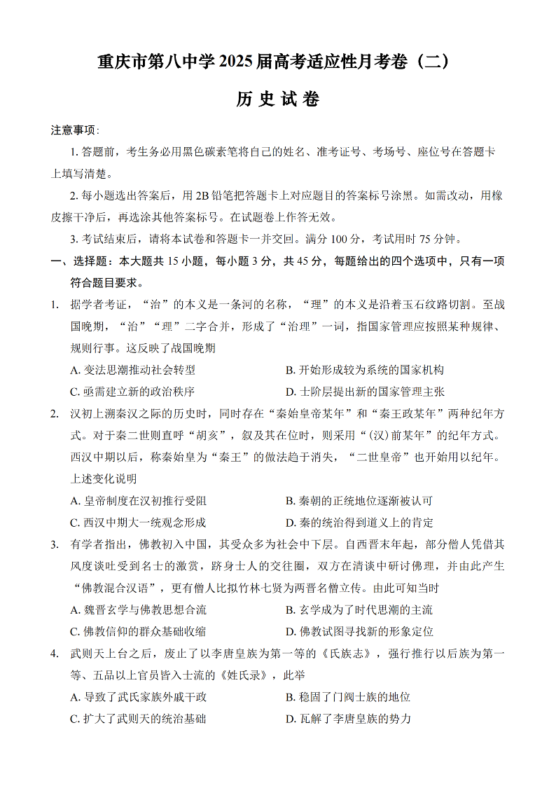 重庆市第八中学2025届高考适应性月考卷(二)历史