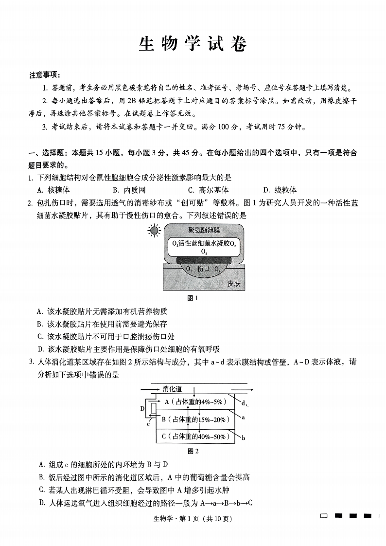 重庆市第八中学2025届高考适应性月考卷(二)生物