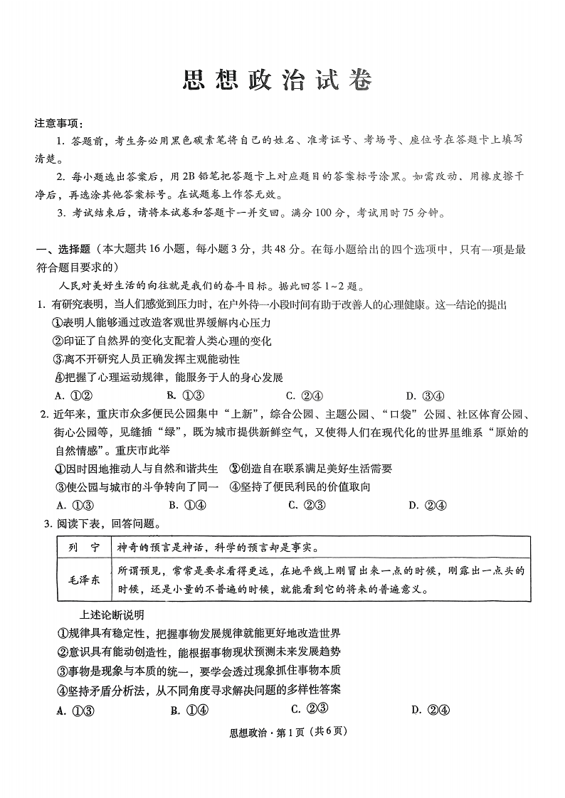 重庆市第八中学2025届高考适应性月考卷(二)政治